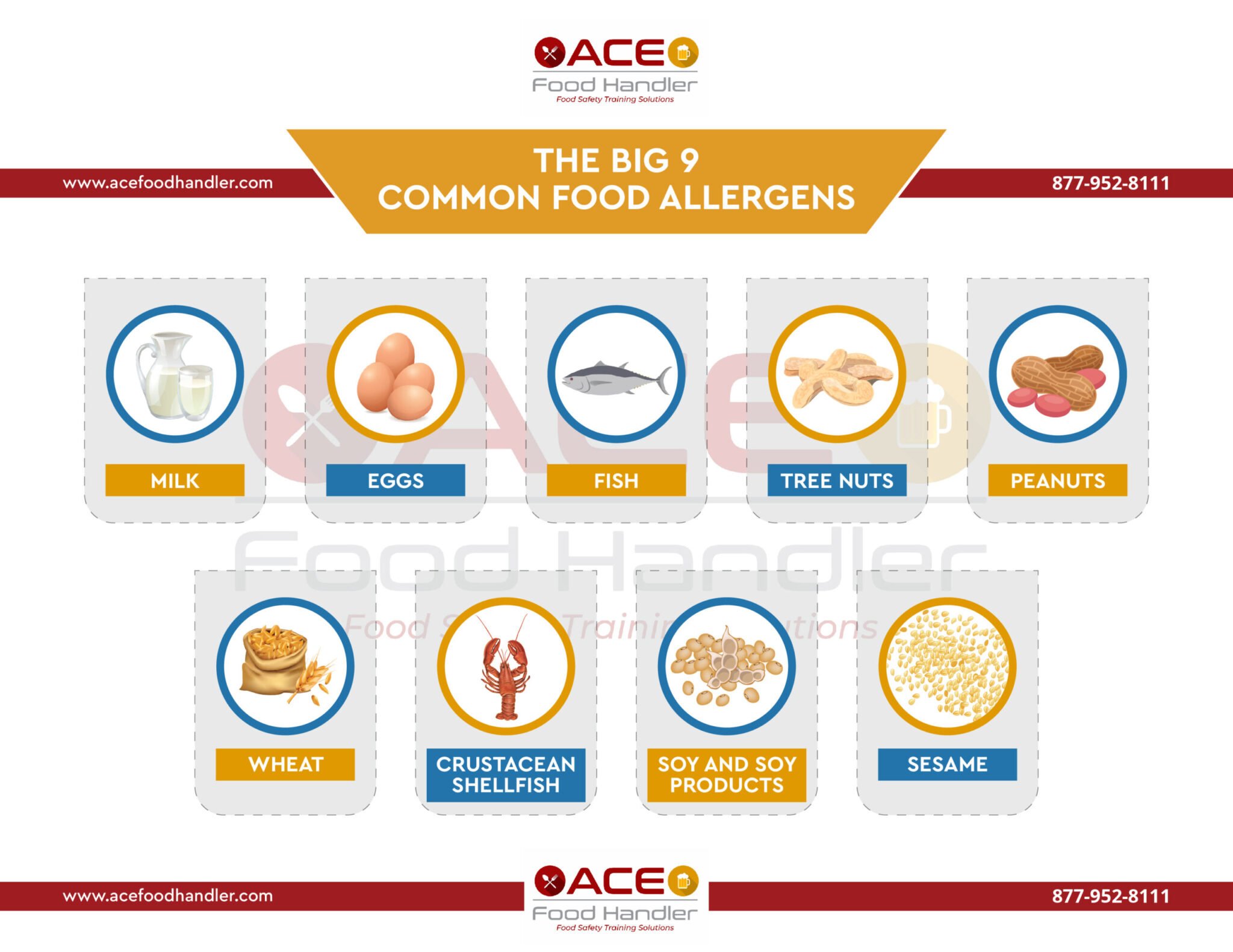 Q: What are the “Big 9” food allergens covered in this course? A: Our Official Food Allergen training covers the nine major food allergens that cause the most severe allergic reactions: Milk, Eggs, Fish, Crustacean Shellfish, Tree Nuts, Peanuts, Wheat, Soybeans, and Sesame. For more detailed information, we recommend referencing the Official FDA Food Allergen resource page.
