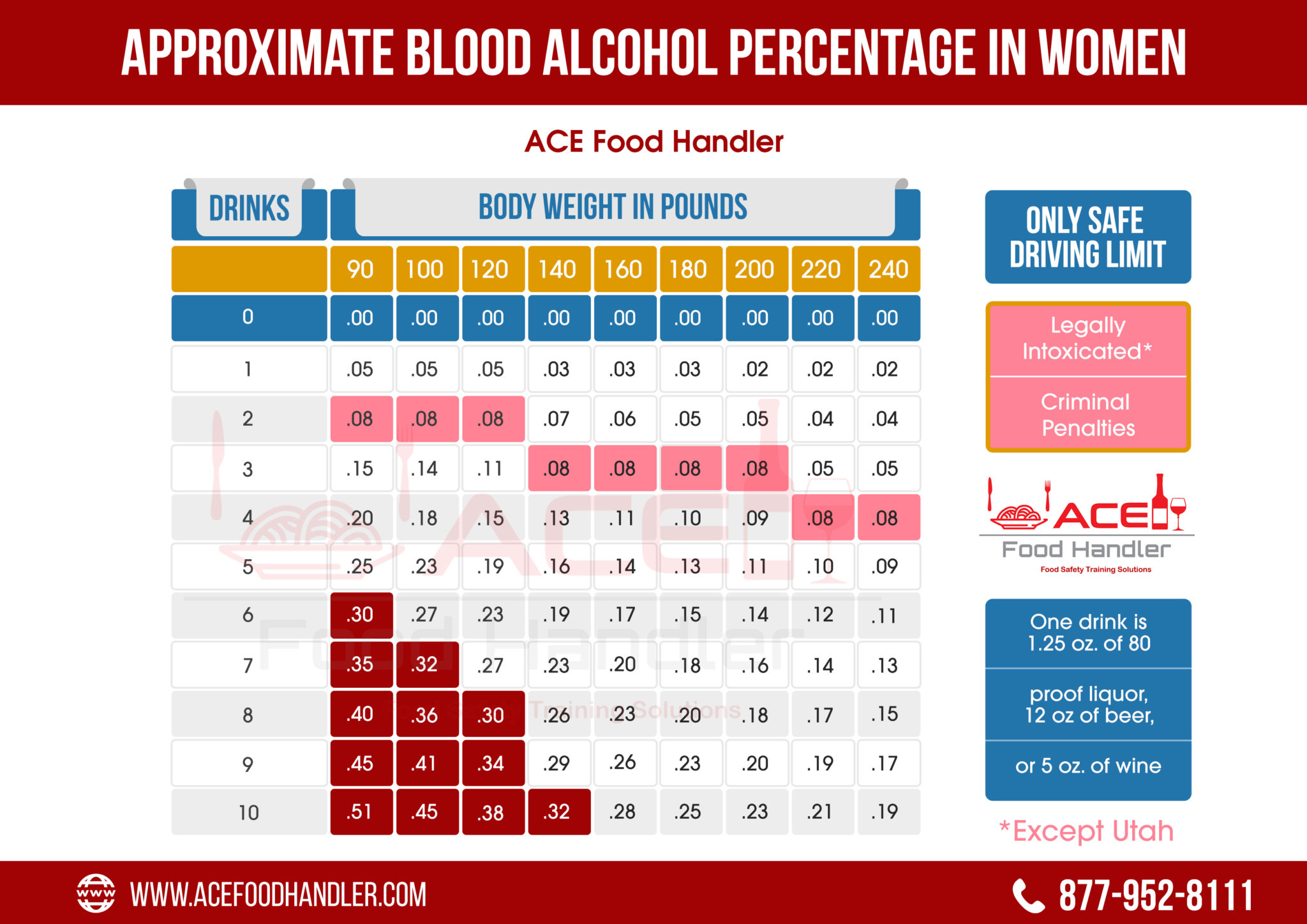 A healthy person can metabolize about 1 standard drink an hour. We have included the BAC charts for both men and women below. While most of the country states that a .08 BAC is Legally Intoxicated it is important to note that in Utah .05 BAC is considered Legally Intoxicated. The Utah BAC Charts and other Alcohol Seller Server aides are available on the ACE Food Handler Resources Page.